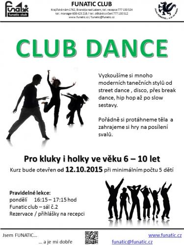 Od 12.10.2015 otvíráme nový kurz pro děti od 6ti let CLUB DANCE. Tančíme, řádíme - prostě nás to baví. Pro kluky i holky - každé pondělí od 16,15hod Rezervace míst již nyní do zpráv nebo na recepci Funatic clubu.