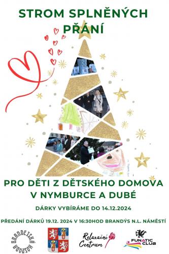 s radostí Vás zveme k zapojení do naší tradiční akce Strom splněných přání 2024, kterou pořádáme pro děti z dětských domovů v Nymburce a Dubé. Naším cílem je vykouzlit těmto dětem krásnější Vánoce, plné radosti, zářivých očí a upřímných dětských úsměvů.